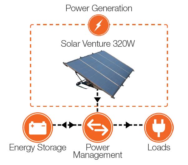 The Solar Venture 320W features high-efficiency photovoltaic (PV) cells in a rugged setup built to withstand extreme environments. The solar array deploys in minutes and comes in a man-portable transport case. Deployment and breakdown are easily manageable by one person, and the rack design allows for maximum exposure to sunlight.