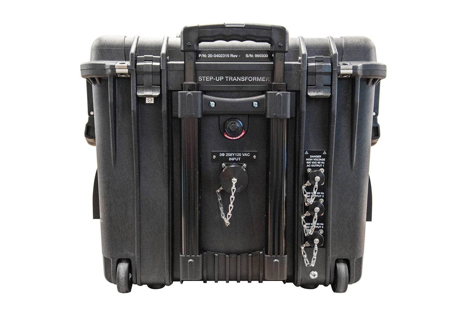 Step-up Transformer: The Step-up Transformer is a portable, three-phase power distribution unit that converts 120 VAC to 600 VAC output across three outlets, each with a 10 A breaker for added safety. Designed with Human Factors Engineering in mind, it features convenient front-facing inputs and outputs, a secure locking system, and efficient ventilation to prevent overheating. Compact yet powerful, this 95 lb unit delivers stable, high-voltage output, ideal for demanding applications.