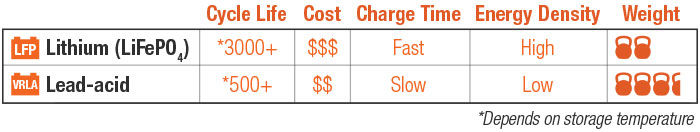 LiFePO4 Energy Storage Modules (ESMs) can endure more charge/discharge cycles than other battery chemistries. Solar Stik uses the LiFePO4 chemistry in almost all its lithium-chemistry ESM products. LiFePO4 is slightly less powerful than other commercially available lithium chemistries, but it has the great advantage of using a nonflammable electrolyte, providing equivalent safety characteristics to lead-acid batteries.