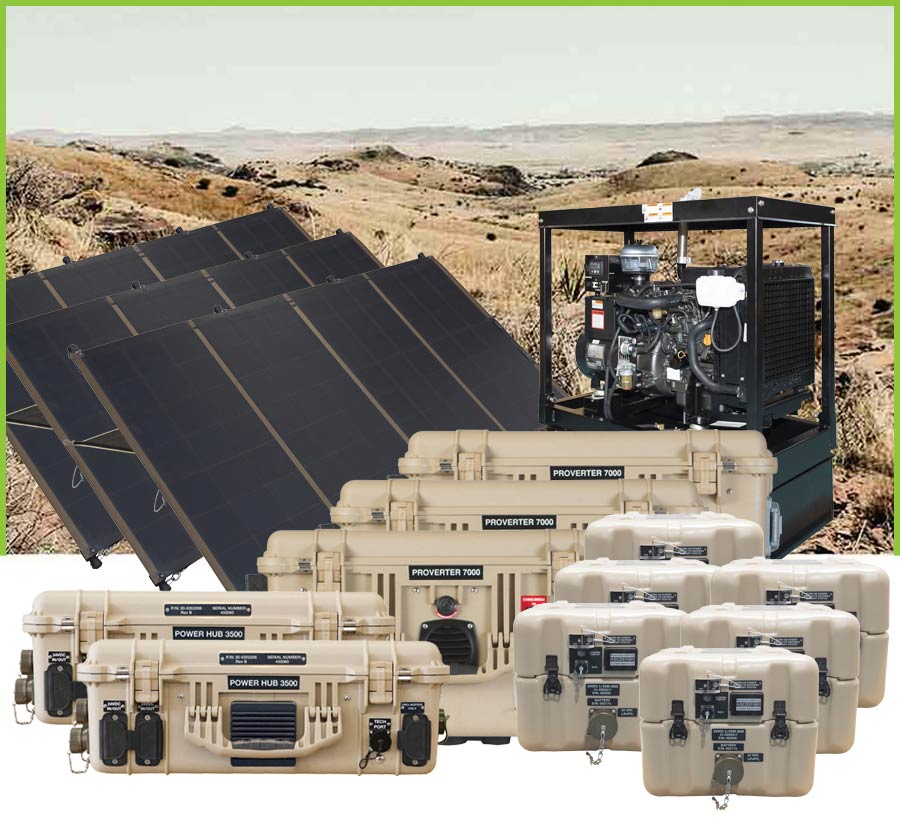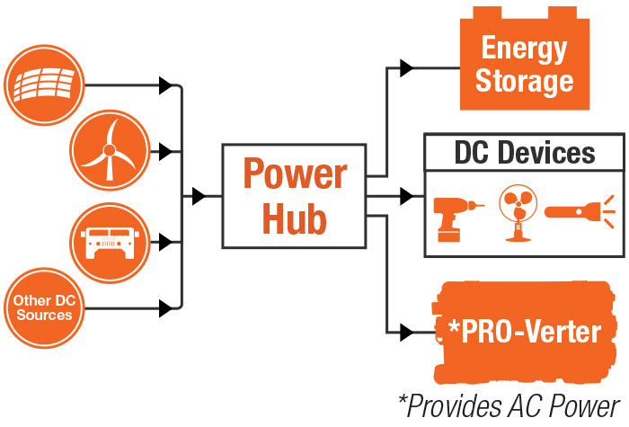 The Power Hub serves as a singular collection point for multiple DC power sources including large portable solar arrays, wind turbines, fuel cells, and more. It can accept up to 2.4 kWh of power generation inputs and is a fully automated system with remote monitoring capabilities.