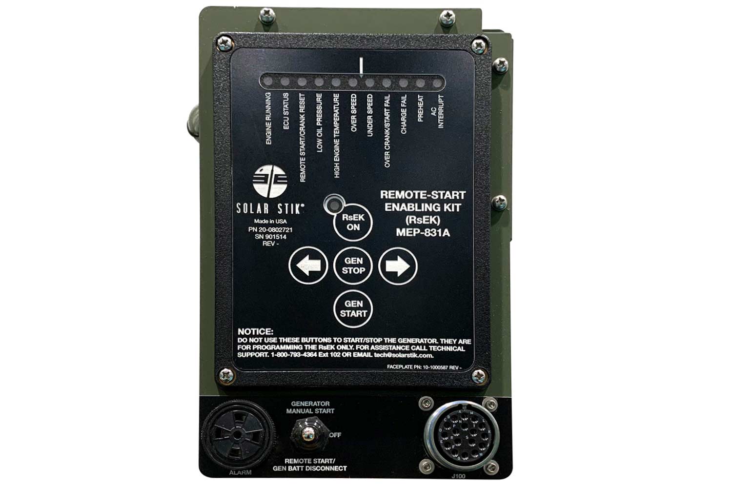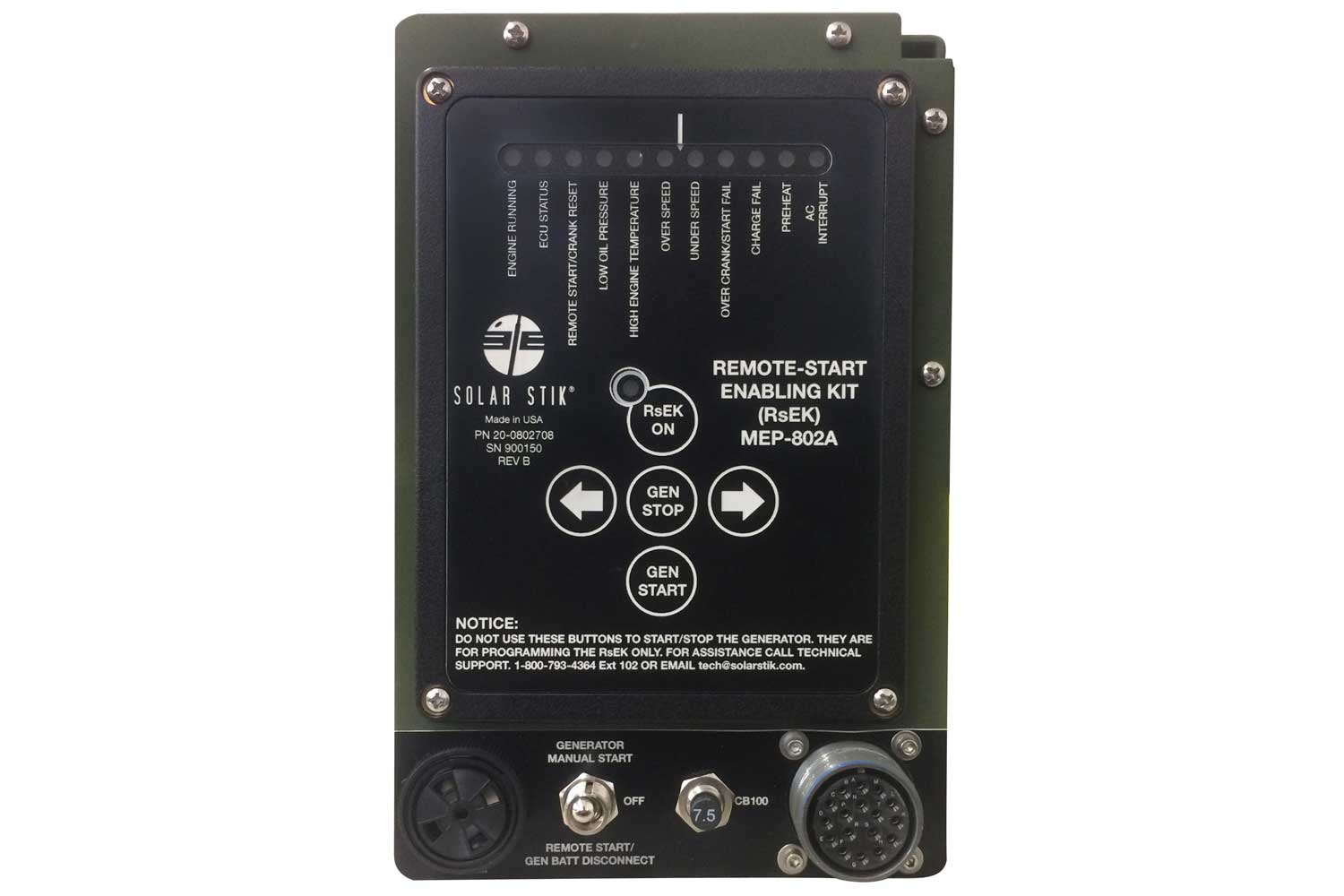 The primary role of the generator in a Solar Stik Hybrid System is to charge the batteries when required. Solar Stik power management components monitor the amount of energy in the battery bank—the components automatically signal the generator to start when the battery bank voltage reaches the system-defined threshold, and automatically signal the generator to stop when the battery bank is fully charged. Most generators—military, commercial, and residential—can be modified to use a Solar Stik RsEK.