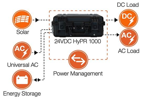 The HyPR is the primary power management module in a small hybrid power system. The HyPR scavenges power from available AC, DC, or renewable sources to charge a connected battery or battery bank. The HyPR then pulls power from the battery or batteries to support various loads.The HyPR can be tailored to power different types of loads and provides users a streamlined control box for small power requirements.
