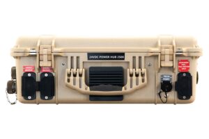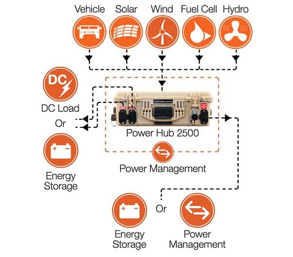 The Power Hub accepts input from DC power sources. It processes and distributes this power to batteries for energy storage, and/or to other power management devices in systems that can deliver AC power. In a DC-only battery based system, the Power Hub can power the load directly.