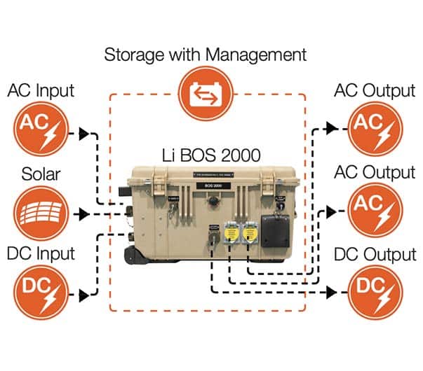 The Li BOS 2000 accepts AC, DC, or Solar power input to charge the internal battery. It can include Auto-Generator Start/ Stop capability to automatically turn on/of various generators for battery recharge based on programmable settings. After bringing power into the battery, the Li BOS then converts battery power to usable 120 VAC or 24 VDC power for distribution to electric loads. The Li BOS provides up to 1400 W of DC power and 2000 W continuous, 4,000 W surge of AC power meaning it can power almost any electronic load that has a standard AC “wall outlet” connection. With over 82 Ah of energy storage that can cycle up to 3000 times, the Li BOS can power loads for several hours from battery power alone. The Li BOS can plug and play with additional energy storage modules (ESMs) for increased battery only runtime.