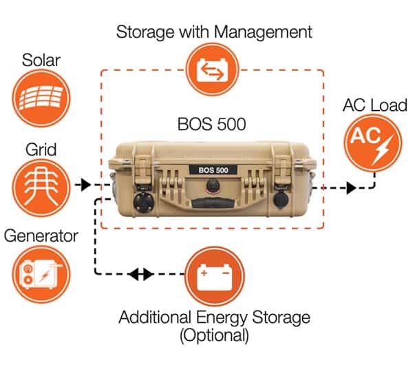 The BOS accepts power generation inputs (e.g., solar, wind, other) and 120 VAC or 230 VAC grid or generator power to charge. AC and DC power loads are connected directly to the BOS. Connect additional energy storage—lead-acid Expander Paks—using Plug & Play connections to increase capacity.