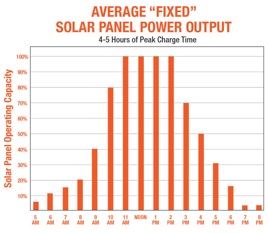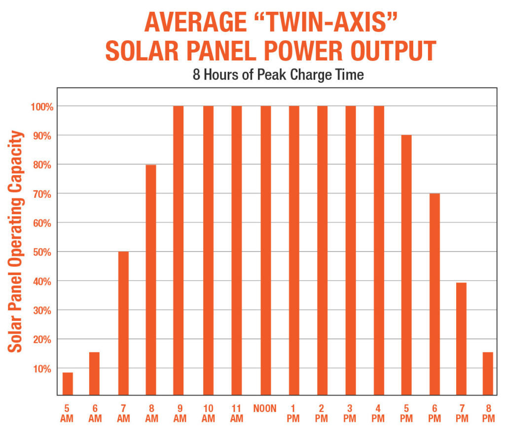 Panel arrays that track the sun automatically or manually, using multiple axes of movement, allow panels to work at 100% of rated output in direct sunlight for a longer period during the day. These arrays generate higher power output for longer times than fixed-angle or single-pitch systems and can adapt to seasonal changes of the sun’s path (declination) across the sky and the daily East-West travel of the sun.