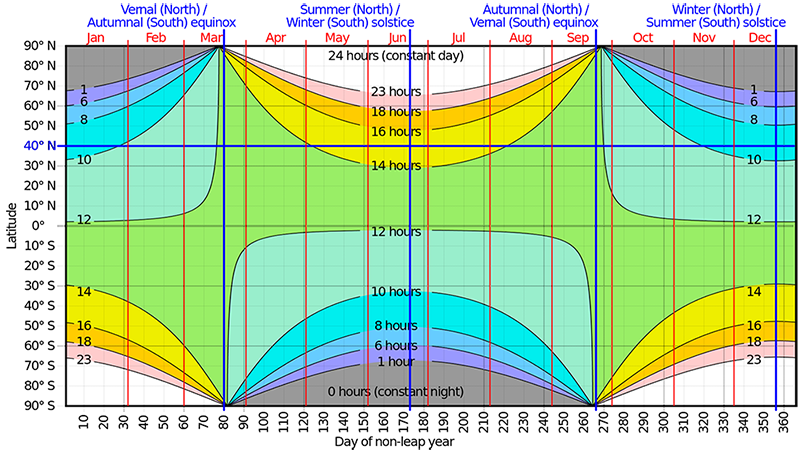This chart illustrates the sunlight one can expect during any time of the year at any latitude and in either hemisphere. The horizontal blue line highlights the seasonal variation of the hours of sunlight at 40º N latitude. This parallel crosses through or near to Chicago, Istanbul, Beijing, and Madrid.