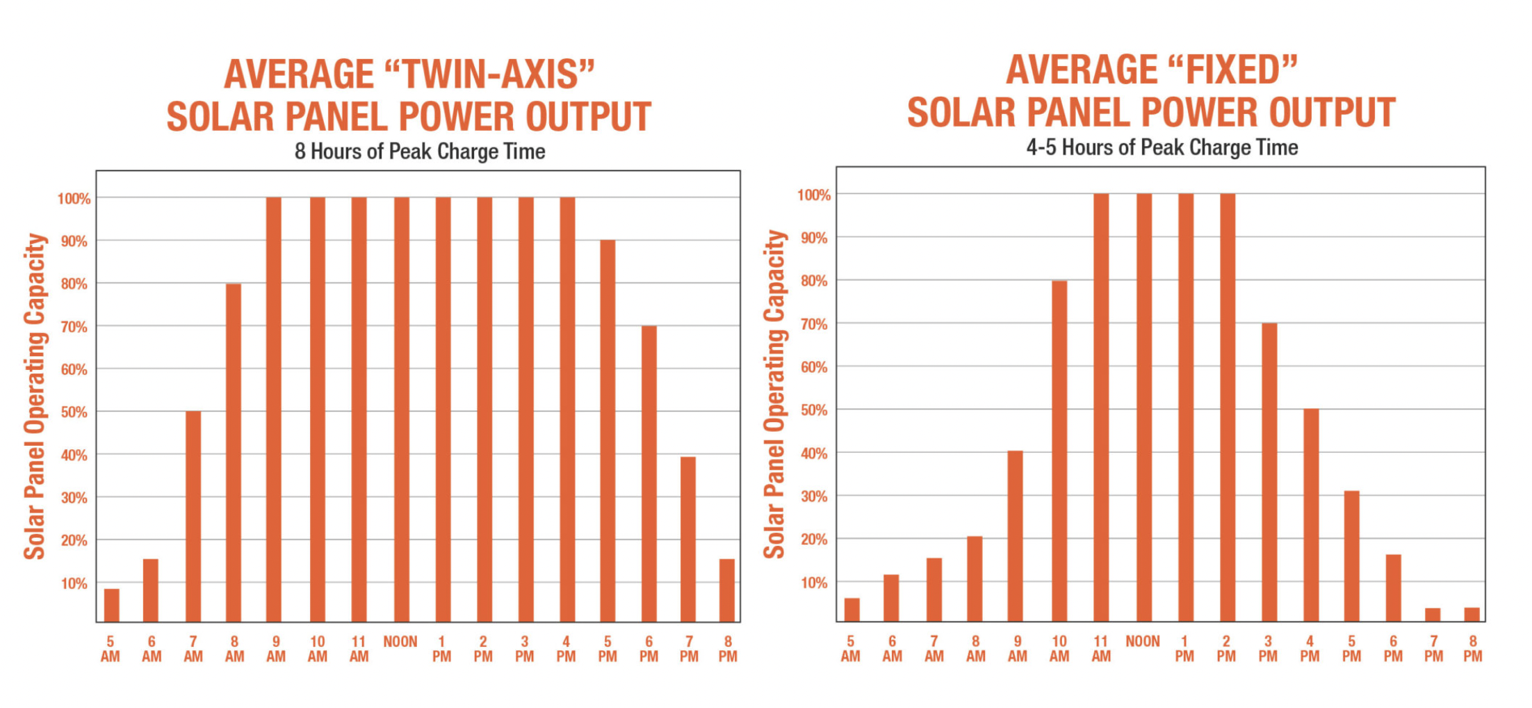 The following graphs demonstrate the differences in power production between a flat or fixed solar PV array and one that is adjustable on two axes of rotation.