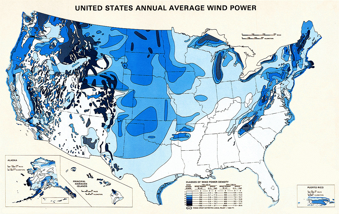 As with any power generation source, it’s best to match a wind turbine’s capabilities to the application. Wind turbines are rated based on maximum power outputs; therefore, a 400 W wind turbine has a maximum power output of 400 W. All wind turbines have a specific wind speed required to begin generating power, and some are as low as 6 mph (9.7 kph). Consult a map of average yearly wind speeds such as the one below for this information.