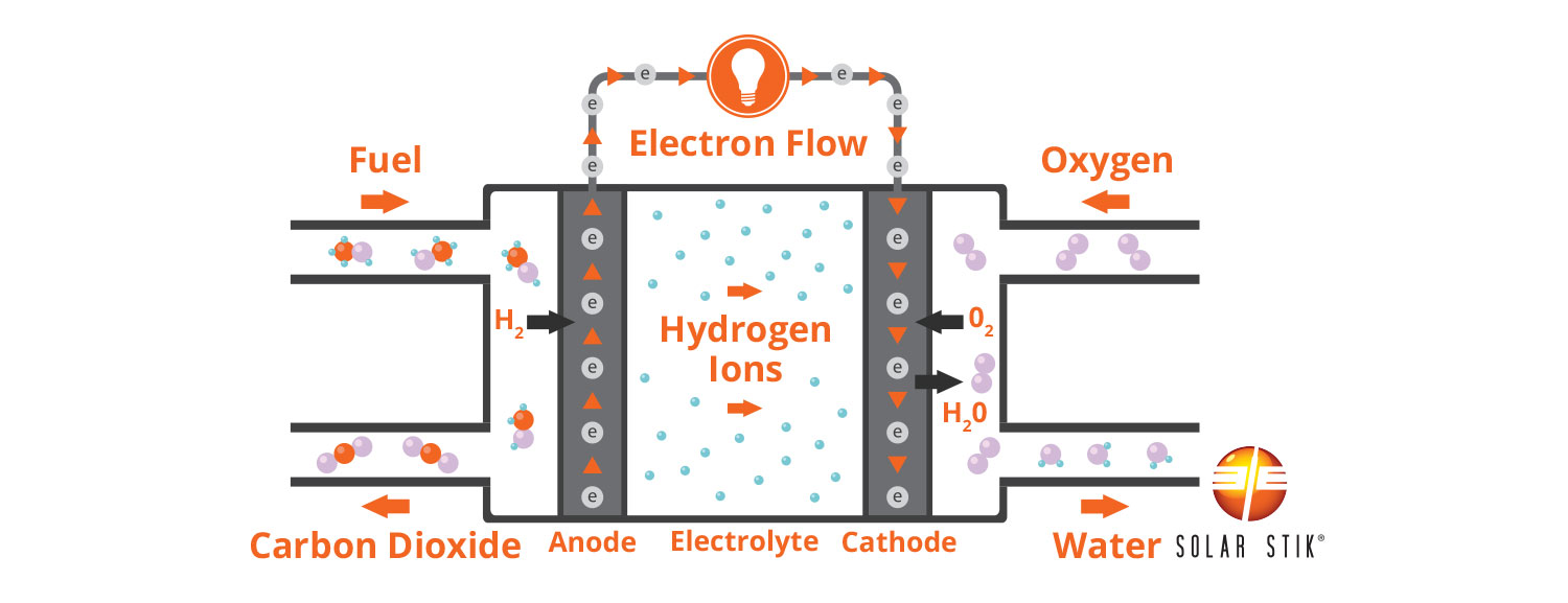 A reaction between the hydrogen and the catalyst occurs at the anode, producing hydrogen ions and electrons. The hydrogen ions travel through the electrolyte to the cathode, while the electrons travel through an external circuit to produce DC current. When the hydrogen ions and electrons meet at the cathode, they react with oxygen, forming water.
