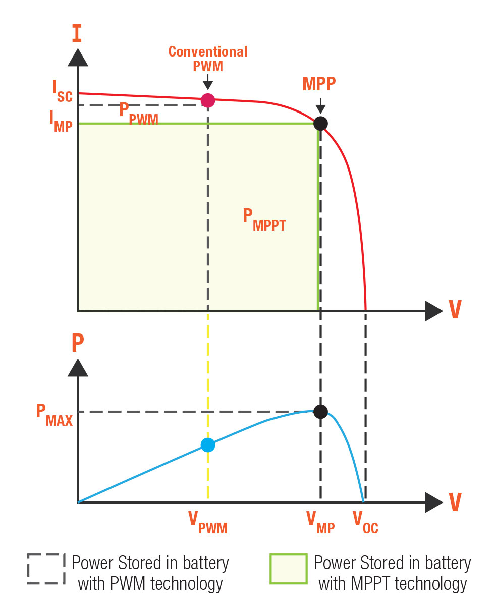 To understand how MPPT works, let’s first consider the operation of a conventional (non-MPPT, such as a series or shunt-type) charge controller. When a conventional controller is used to process solar power for charging a battery, it simply connects the modules directly to the battery. This forces the modules to operate at battery voltage, which is typically not the ideal operating voltage at which the modules are able to produce their maximum power. These simple charge controllers stop charging a battery when a certain voltage level is reached and reinitiate charging when the battery voltage drops back below that level.