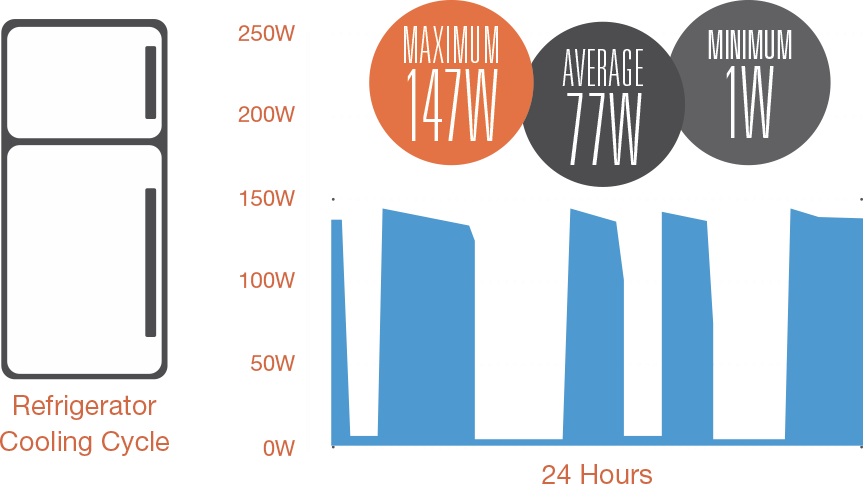 Now consider STIKmann’s refrigerator. The power consumption rating given on the refrigerator’s specification plate is 60 W. He uses the system voltage in the formula to determine the refrigerator draws 5 A of current when operating: