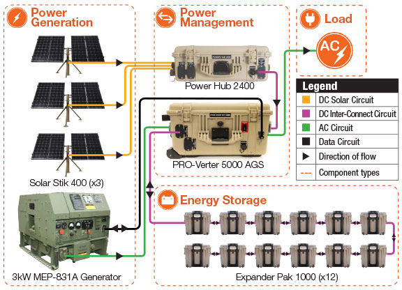 The Solar Stik 3.0 kW Hybrid Power System is composed of rugged components that are proven to operate in extremely harsh environmental conditions and use simple principles for operation—scalability, adaptability, and autonomy. The modularity of the Solar Stik System allows for easy scaling up or down based on the load requirement, and the operator can choose the exact capabilities to meet their mission requirements. Open architecture allows for the integration of additional components often used in the field that are not native to the Solar Stik System. Batteries provide power on demand to the load, and only the exact amount of power that is required to support the load is used. The Solar Stik Hybrid Power System consists of power generation, power storage, and power management components that work in concert to ensure high overall operating efficiency and that the most operationally effective energy source is used first.