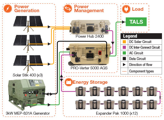 The REF’s Operational Energy (OE) Advisors integrated a Solar Stik 3kW HPS into the TALS power system. The HPS is comprised of solar arrays, power management components, and energy storage (batteries) along with the 3 kW TQG. The highly efficient HPS configuration reduced generator runtime by powering the TALS from energy stored in the batteries rather than directly from the 3 kW TQG.