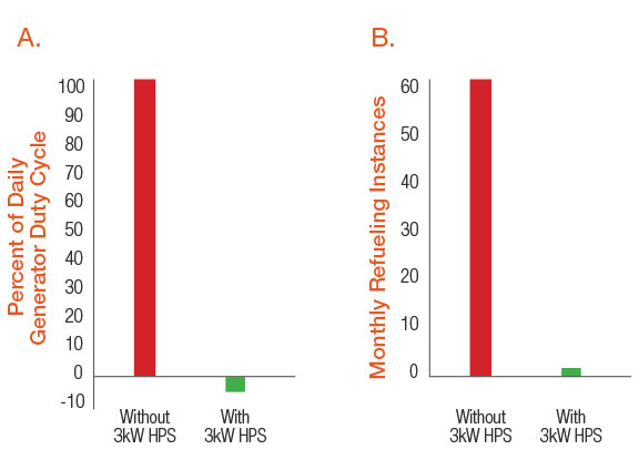 Integrating the HPS into the TALS power system was successful in solving the root problem. Generator runtime was reduced significantly. On most days, the solar arrays provided all of the power required to support TALS (Figure 3 A). With the HPS integrated, the TQGs ran so infrequently that they required refueling only one time per month rather than two times per day (Figure 3 B). TQG maintenance intervals were also increased significantly due to the reduced runtime. Ninety percent of the energy required to support the operation was provided by solar power.
