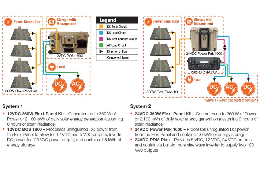 Figure 3 depicts the solutions the two companies selected to power the different communications support systems. Although neither power system was originally designed to work with communications equipment, the adaptability and open architecture inherent to the Solar Stik design allowed both solutions to effectively power Focused Mission’s devices.