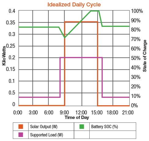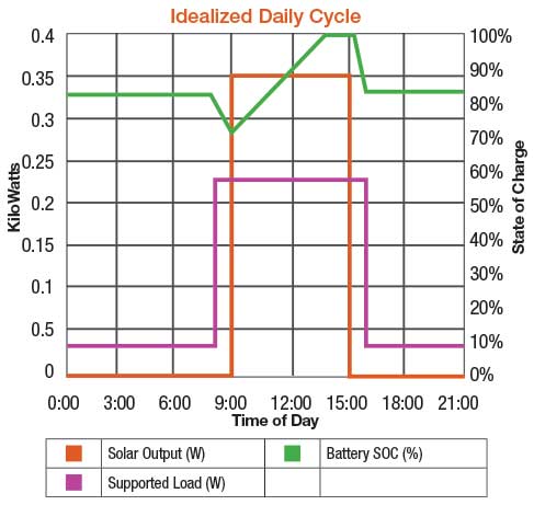 With solar recharging, figures 4 and 5 show the 24VDC Flexi- Panel Kit 360s in both systems were able to generate enough power to keep the loads running 8-10 hours per day for an indefinite number of days. During ideal conditions, the battery state of charge (SOC) in System 1 never dropped below 71% and in System 2 never dropped below 60%, ensuring both systems had power. Even without solar recharging or days without sun, both systems would operate for over five hours purely off energy storage.